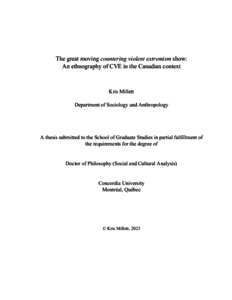 In Chapter 1 - Searching for the CVE space I discuss my immersion in CVE and the type of fieldwork activities conducted. I also attempt to define my research object, outlining how CVE comprises a field of practice, a paradigm, a moral-social imperative, and lastly a space. Chapters 2 and 3 historicize CVE’s contemporary presence and disturb common understandings of its origins. I critique the explanation of CVE’s rise as a necessary and spontaneous reaction to evolving security threats to understand it as an outcome of performative security knowledge, where new security threats are discursively created rather than responded to. Chapters 4 and 5 focus on my fieldwork experience, examining how actors ‘enroll’ in the CVE cause through the open-ended, speculative quality of its activities. A distinction emerged with Muslim-identifying CVE practitioners, whose motivations to represent their communities in often hostile institutions and reduce the harm of CVE practices were typified by the repeated phrase “if you’re not at the table, you’re on the menu”. In the conclusion chapter I connect the varying threads of preceding analysis and what they portend for CVE’s effects on societies. This includes examining how CVE’s efforts to redirect political grievances toward ‘pro-social’ ends potentially disempowers social justice movements, reinforcing state hegemony and existing power inequities.