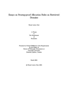 Osei, Ernest Lartey (2023) Essays on Strategyproof Allocation Rules on Restricted Domains. PhD thesis, Concordia University.