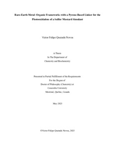 Quezada Novoa, Victor Felipe (2025) Rare-Earth Metal–Organic Frameworks with a Pyrene-Based Linker for the Photooxidation of a Sulfur Mustard Simulant. PhD thesis, Concordia University.