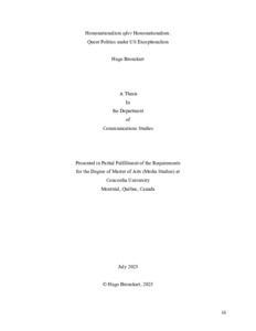 This theory-based thesis presents an in-depth study of Jasbir Puar’s concept of homonationalism. This term illuminates how the selective inclusion of (some) queer subjects within the nationalist project happens at the expense of racialized populations. In positioning homonationalism within the alternate critical genealogies of queer of color critique and women of color feminism, I demonstrate that these theoretical contributions were essential to Puar’s theorization of homonationalism through their early critiques of the appropriation of LGBTQIA+ rights for nationalist ends. I explore the origins and manifestations of homonationalism through the discourses of sexual exceptionalism and the semiotic construction of the “monster-terrorist-fag” in relation to normative national queer subjects. In an effort to theorize our present moment marked by the rise of fascism and authoritarianism, I investigate phenomena that signal the persistence of homonationalism in our present moment, despite new anti-LGBTQIA+ legislation, what I call homonationalism after homonationalism. Paying attention to the resonances between the present, the War on Terror, and Trump’s first presidency, I attempt to identify the shifting figure of the “monster-terrorist-fag” defined through present-day processes of detention and deportation as well as through deployments of US sexual exceptionalism. Ultimately, this thesis is an effort to evaluate the salience of the concept of homonationalism in a shifting sociopolitical context.