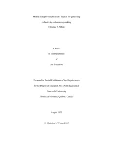 This study looks at four cases surrounding mobile disruptive architecture. A niche method for delivering pop-up arts-based programming via bikes, bike trailers, or trollies and into public space. Using mixed-methods, qualitative interview data from practitioners are understood through thematic analyses and compared alongside auto-ethnographic accounts. Henry Lefebvre’s (1991) theory of social space, Chantal Mouffe’s (2007) theory of agonistic interventions and Christina Standerfer, et al.’s (2022) theory on community readiness are also applied. My research question asks, How does mobile disruptive architecture generate new meaning in relation to place, and new forms of collectivity while fostering public dialogue? The projects analyzed are: 1) Bakery of Bread and Roses and its sequel, Museum on Wheels based in Tiohtià:ke/Montreal; 2) Art Spin based in Toronto; 3) El BiciCrófono based in Los Angeles; and 4) PedalBox Gallery based in Tiohtià:ke/Montreal. This study includes an overview of each project and discusses the tactics involved in doing this work. It investigates the forms of collectivity that emerge and shows how meaning is generated in and through these projects. I advocate for further research into the experiences of those encounters from the perspective of the participant rather than the practitioner to gain better insight into the pedagogical potential of this method of social engagement.