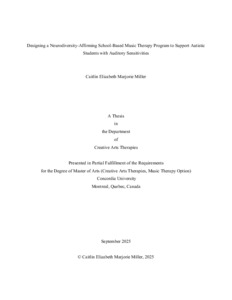 Miller, Caitlin Elizabeth Marjorie (2025) Designing a Neurodiversity-Affirming School-Based Music Therapy Program to Support Autistic Students with Auditory Sensitivities. Masters thesis, Concordia University.