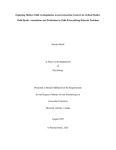 Mesli, Nesrine (2025) Exploring Mother-Child Co-Regulation Across Interaction Contexts in At-Risk Mother-Child Dyads: Associations and Predictions to Child Externalizing Behavior Problems. Masters thesis, Concordia University.