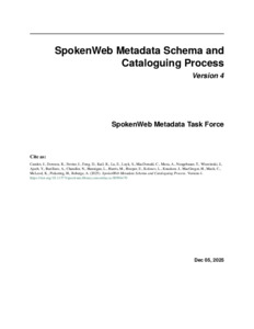 | Additional Information: | Cite as: Camlot, J., Dowson, R., Ferrier, I., Fong, D., Kail, R., Lu, E., Luyk, S., MacDonald, C., Meza, A., Neugebauer, T., Wiercinski, J., Ajeeb, Y., Barillaro, A., Chandler, N., Hannigan, L., Harris, M., Hooper, E., Kolosov, L., Knudsen, J., MacGregor, H., Mash, C., McLeod, K., Pickering, H., Roberge, A. (2025). SpokenWeb Metadata Schema and Cataloguing Process. Version 4. https://doi.org/10.11573/spectrum.library.concordia.ca.00996470 |